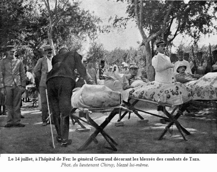 RÉCOMPENSES AUX BLESSÉS DE TAZA Le 14 juillet, à Fez, a été marqué par une cérémonie très émouvante qui s'est déroulée dans l'intimité, pour ainsi dire, entre soldats, à l'hôpital Auvert. C'est là qu'ont été évacués les blessés des troupes du Maroc occidental frappés au cours des combats livrés autour de Taza, tant de ceux que le général Gouraud dut engager pour s'ouvrir le passage que de ceux qu'il eut à subir depuis pour se maintenir, assurer notre occupation, et dont nous sommes loin, probablement, d'avoir livré le dernier: mardi encore, on recevait la nouvelle de deux très importants engagements, dans la vallée de l'Innaouen, au cours desquels nous aurions eu plus de cinquante morts.