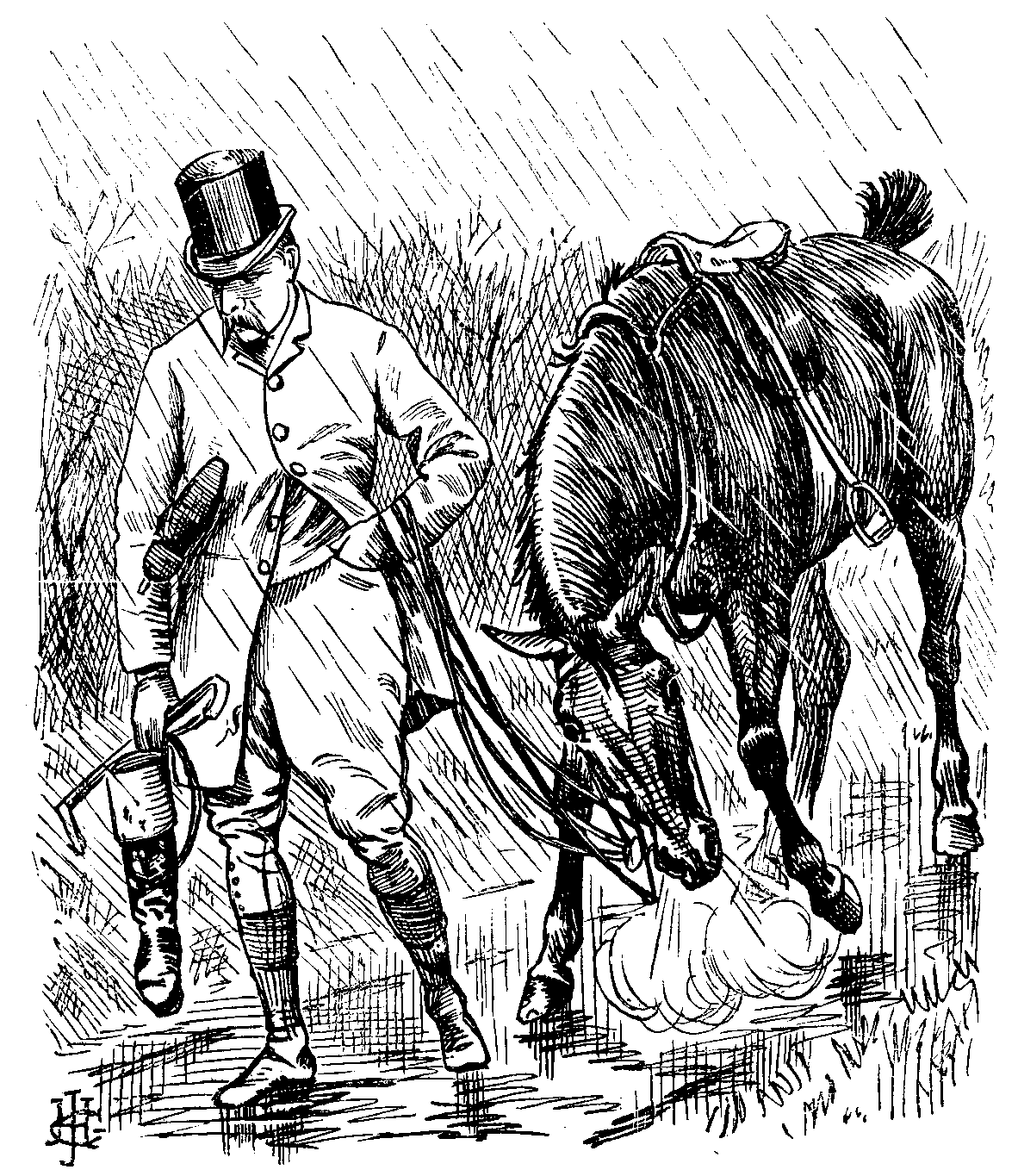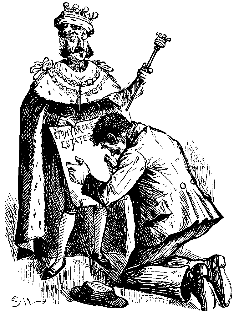 Fifth S.C. (a fat, fair man, with an impudent frog-face, who is trying desperately hard to take in a sceptical crowd with the too familiar purse-trick). Now look 'ere, I don't mind tellin' yer all, fair an' frank, I'm 'ere to get a bit, if I can; but, if you kin ketch me on my merits, why, I shan't grumble—I'll promise yer that much! Well, now—(to a stolid and respectable young Clerk)—jest to show you don't know me, and I don't know you—(he throws three half-crowns into the purse). There, 'old that for me. Shut it. (The Clerk does so, grinning.) Thank you—you're a gentleman, though you mayn't look like it—but perhaps you're one in disguise. Now gimme 'arf a crown for it. Yer won't? Any one gimme arf a crown for it? Why—(unprintable language)—if ever I see sech a blanky lot o' mugs in my life! 'Ere, I'll try yer once more! (He does.) Now oo'll gimme arf a crown for it? (To a Genteel Onlooker, with an eyeglass, who has made an audible comment) "See 'ow it's done!" So yer orter, with a glazier's shop where yer eye orter be! Well, if anyone had 'a told me I should stand 'ere, on Boat-Race Day too, orferin' six bob for arf a crown, and no one with the ordinary pluck an' straightforwardness to take me at my word, I'd have suspected that man of tellin' me a untruth! (To a simple-looking spectator.) Will you 'old this purse for me? Yer will? Well. I like the manly way yer speak up! (Here the Gent. Onl., observing a seedy man slinking about outside, warns the company to "mind their pockets"—which excites the Purse-seller's just indignation.) "Ere!—(to the G.O.) you take your 'ook! I've 'ad enough o' you. I 'ave. You're a bloomin' sight too officious, you are! Not much in your pockets to mind—'cept the key o' the street, and a ticket o' leave, I'll lay! If you carn't beyave as a Gentleman among Gentlemen, go 'ome to where you 'ad your 'air cut last—to Pentonville! (The G.O. retires.) There, we shall get along better without 'im. 'Ow long are you goin' to keep me 'ere? Upon my word an' honour, it's enough to sicken a man to see what the world's come to! Where's yer courage? Where's yer own common sense? Where's your faith in 'umin nature? What do yer expect? (Scathingly.) Want me to wrop it up in a porcel, and send it 'ome for yer? Is that what yer waitin' for! Dammy, if this goes on, I shall git wild, and take and give the bloomin' purse a bath! (The Simple Spectator feels in his pockets—evidently for a half-crown.) 'Ere, you look more intelligent than the rest—I'll try yer jest this once. Jest to show yer don't know me, and—(Shouts of "They're off! They're coming!" from the bank; the Purse-seller's audience suddenly melts away, leaving him alone with the Seedy Slinker.) 'Ere, JIM, we may as well turn it up. 'Ere come them blanky boats!