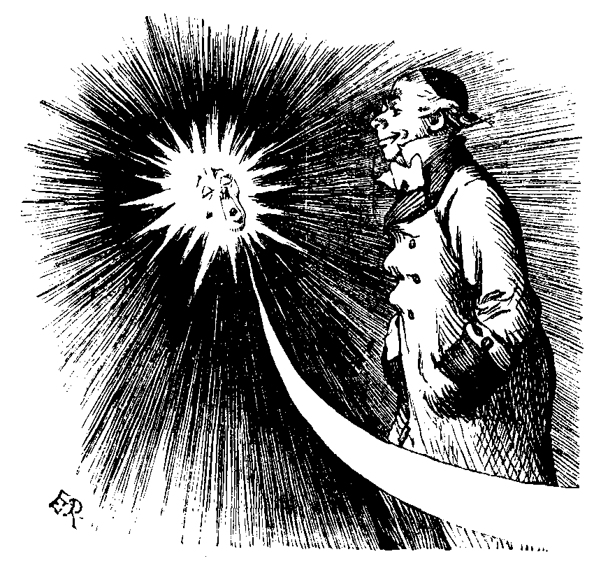 A Vendor. Now all you who are fond of a bit o' fun and amusement, jest you stop and invest a penny in this little article I am now about to introdooce to your notice, warranted to make yer proficient in the 'ole art and practice of Photography in the small space of five seconds and a arf—and I think you'll agree with me as it ain't possible to become an expert photographer at a smaller expense than the sum of one penny. 'Ere I 'old in my 'and a simple little machine, consistin' of a small sheet of glorss in a gilt frame. I've been vaccinated five 'underd-and-forty-one times, never been bit by a mad dog in my life, and all these articles have been thoroughly fumigated before leaving the factory, therefore you'll agree with me you needn't be afraid o' catchin' the Inflooenza. They tell me it's nearly died out now—and no wonder, with everythink a cure for it—but this article is a certain remedy. All you've got to do is to bite off a corner of the glorss, takin' care to be near a public 'ouse at the time, chew the glorss into small fragments, enter the public 'ouse, call for a pot o' four ale, and drink it orf quick. It operates in this way—the minoot portions of the glorss git between the jaws of the microbe, preventin' 'im from closin' 'is mouth, and thereby enablin' you to suffocate 'im with the four ale. (To the Reader.) Will you allow me to show you how this little invention takes a photograph, Sir? kindly 'old it in your 'and, breathe on it, and look steadily on the plate for the space of a few seconds. (All of which the Reader, being the soul of courtesy, obligingly does—and is immediately rewarded by observing the outline of a donkey's head produced upon the glass.) Now if you'll 'and that round, Sir, to allow the company to judge whether it ain't a correct likeness— [But here the Reader will probably prefer to pass on.
