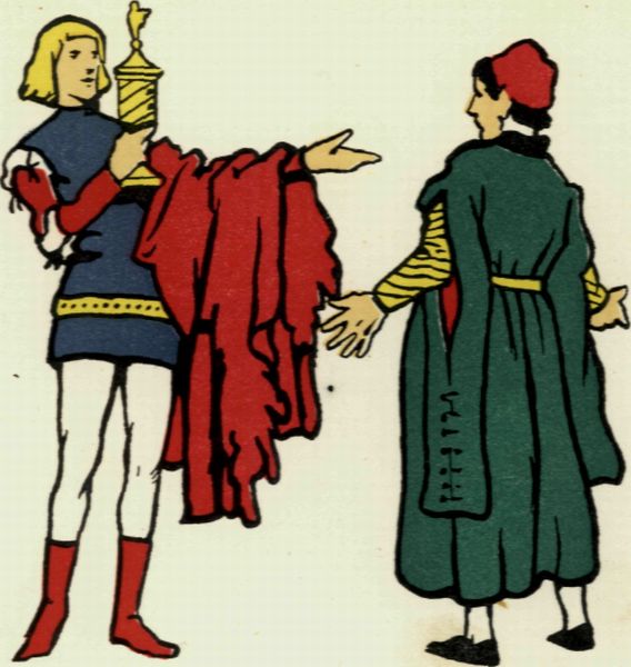 ''Twere best,' said Fleur, 'for me to travel as a merchant; so give me, I pray you, twelve mules, three laden with skins, three with coin of the realm, two with costly apparel of silk, velvet and scarlet, and the other four with furs. Give me also twelve muleteers to lead the mules, and twelve men-at-arms to be my guard; likewise one of your stewards, and a chamberlain of wisdom and discretion; last of all, send with me the two merchants, who, having sold Blanchefleur into distant lands, will best know how and where to seek her.'