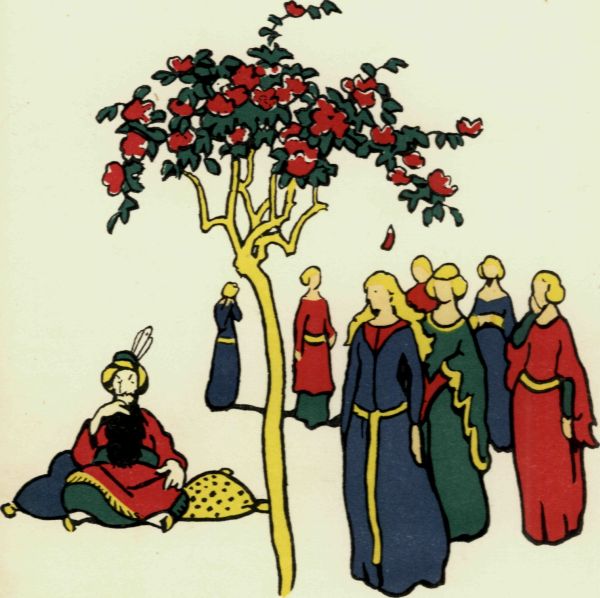 'Every springtide the Admiral takes to him a wife; and when the year is out, he calls to him all the lords, kings, and princes of his realm, and in their presence casts off his wife, and causes a knight to behead her, that no man may wed her after him; thus with the bitterness of an early death does she pay for the fleeting honour of royal wedlock; and when his wife is dead, the Admiral, with intent to replace her with another, summons the maidens who are within the tower to appear before him in a garden, which trembling they enter, none coveting the fatal honour of his choice. This garden, which walls of gold and lapis-lazuli enclose, contains noble trees of every kind, so that in it may be found at all seasons every fruit known to mankind; precious spices also abound, such as ginger, cinnamon, balm, cloves, nutmeg, and mace; all which, together with the scent of flowers and the song of birds, makes of this garden a very earthly paradise. In the midst of this paradise gushes forth a spring of clear water, and overhanging the spring is a tree, ever green and ever putting forth fresh blossoms and varied fruits.