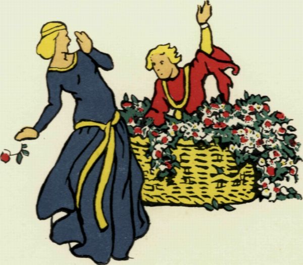 At the bidding of his watchman friend Fleur went back to his lodging, and there in hope and joy abode for two long days; and when the third, which was May Day, dawned, he arose and clad himself from head to foot in rosy red and hasted to the tower; and when he came to the guard-room, he found a great basket on the floor, and heaped up around the basket were all the fresh-blown flowers of spring that the watchman had caused to be gathered from the gardens of Babylon, as May-Day offering to Blanchefleur.