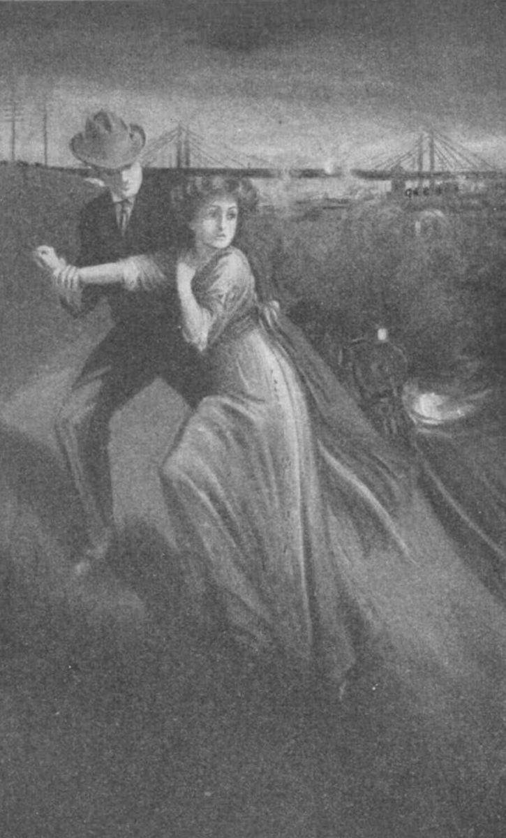 Just then the fiery eye of the oncoming train burst from the tunnel ahead. Instinctively, the young man caught his companion's arm and drew her forward to the embankment beyond the bridge, holding her, startled and trembling, as the screaming train tore past them.