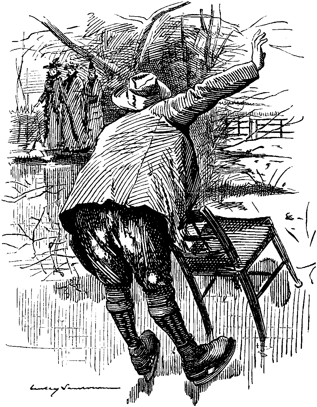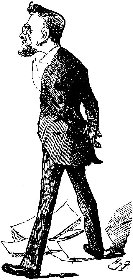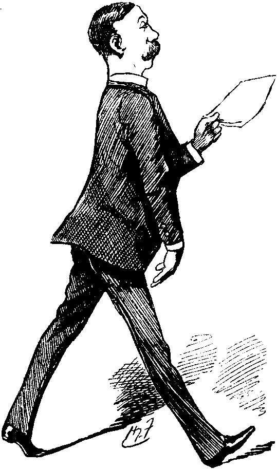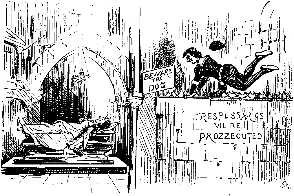 In the Street—about 11:30 P.M.—Back from Variety Theatre. Hotel doors closed. Have rung several times—no result at present. Curious impression that I shall be hauled up before a Dean or somebody for this to-morrow and fined or gated. Wish they'd let me in—chilly out here. Is there a night-porter? If not—awkward. Carillon again from Cathedral tower. Ghost has managed to recollect a whole tune at last, picking it out with one finger. Seem to have heard it before—what the Dickens is it? Recognise it as the "Mandolinata in E." Remember the VOKES Family dancing to it long ago in the Drury Lane Pantomime. Not exactly the tune one would expect to meet in a Cathedral.... Unbolting behind doors. Nervous feeling. Half inclined to assure Porter penitently that this shall not occur again. Wish him good-night instead—pleasantly. Porter grunts—unpleasantly. Depressing to be grunted at the last thing at night. To bed, chastened.
