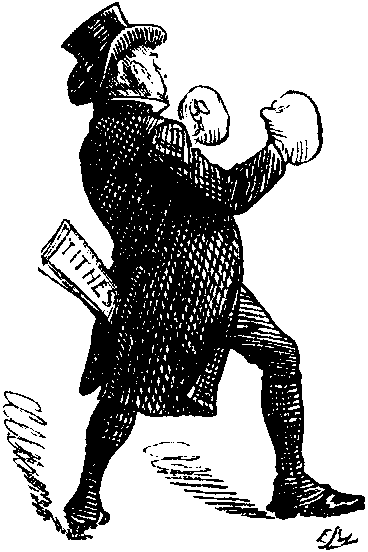 At Table d'hôte.—Fellow-countrymen to the fore; both my immediate neighbours English, but neither shows any inclination to converse. Rather glad of it; afternoon of Museums and Galleries instructive—but exhausting. Usual Chatty Clergyman at end of table, talking Guide-book intelligently; wife next him, ruminating in silence and dismally contemplating artificial plant in a plated pot in front of her. It is a depressing object—but why look at it? Horror of two Sportsmen opposite on being offered snipe. "Snipe now—Great Scott!" they exclaim, "And ain't they high too?" One helps himself to some, with a sense that being on the Continent makes all the difference. But even his courage fails on being offered stewed apricots with it. Close by a couple of Americans; a dry middle-aged man, and a talkative young fellow who informs him he was at Harvard. Elder man listens to him with a grim and wooden forbearance. "Ez fur languages," the younger man is saying. "I'd undertake to learn any language inside of six months. Fur enstance, I got up Trigonometry in two. You'll tell me that isn't a language, and that's so, but take Latin now, I'd learn Latin—to write and speak—in a year, Italian I'd learn in a fortnight—with constant study, you understand. Then there's German. Well. I cann't read German—not in their German text, I cann't, and I don't speak it with fluency, but I can ask my way in it, and order anything I want, and I reckon that's about as much as a man requires to know of any language. Will you take a glass of wine outer my bottle? I've another coming along." Elder man declines stiffly, on plea that he is almost a teetotaller. "Well, maybe you're wise," says the Harvard man, "but I've discovered a thing that'll put you all right in the morning when you've eaten or drunk more'n's good for you overnight. I'll tell you what that thing is. It's just persly—plain ordinary simple persly. You eat a bunch o' fresh persly first thing you get up, and it don't matter what you've taken, you'll feel just as bright!" Elder man, who has been cutting up his chicken into very small pieces, looks up and says solemnly, "You may consider yourself vurry fortunate in being able to correct the errors you allude to by a means which is at once so efficacious and so innocent." After which he subsides into his salad. Harvard man shut up.
