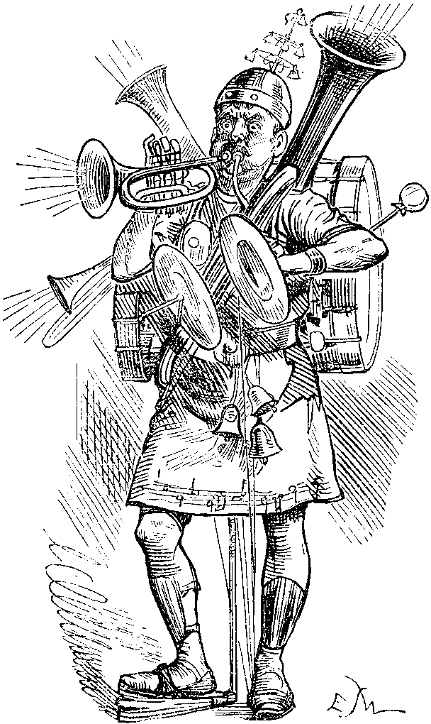 Wednesday.—WAGNER. Vainly the Daughters of the River, representing the floating capital of the Banks of the Rhine, cry "Woa! Woa!" The orchestra, under the direction of Herr MAHLER, takes no notice of them, but goes on Wagnerianly, inexorably. Thus swimmingly we reach Walhall—where the fire-god Loge has a logement with very heavy insurance. Wotan and Loge in search of the gold. Then we meet the Nibelungs and the Nibelights, all livers under a water-cure system; and then—it's like a musical nightmare—Alberich changes himself into a toad and is towed off as a prisoner. Fafner settles Fasolt by a drum-head Court Martial, so that Fafner gets the golden honey, and Fasolt gets the whacks—and—please, Sir, I don't know any more—but some of the music is running river-like and lovely, more is puzzling, and much of it must remind Sir DRURIOLANUS of the rum-tum-tiddy-iddy-iddy-um-bang-whack of a great Drury Pantomime. House full; Duke and Duchess of EDINBURGH, with Princess MARIE and Crown Prince of ROUMANIA, enjoying themselves Wagnerially and Rou-manically.