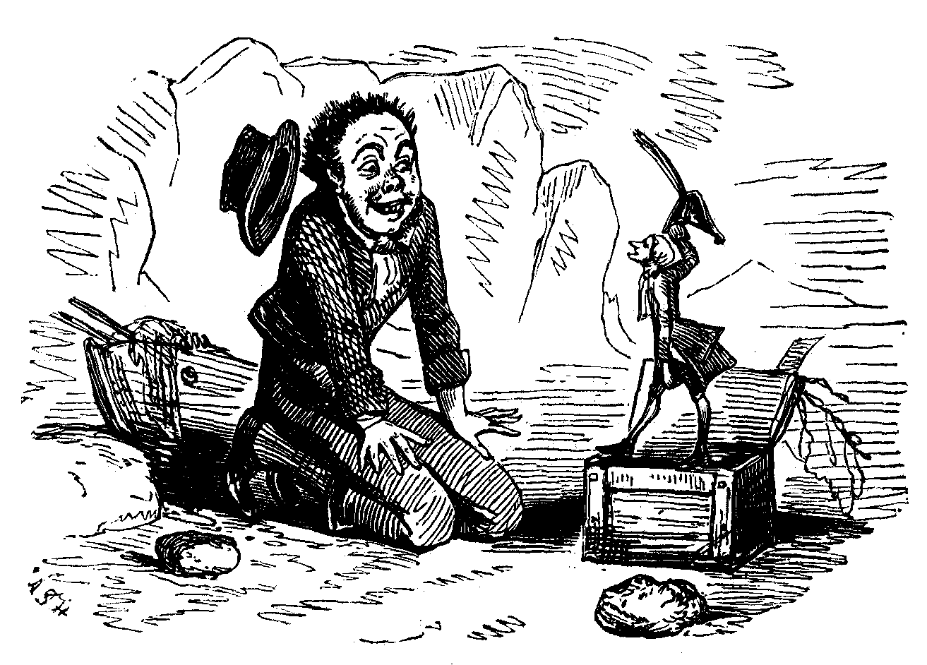 “‘Millia murdher!’ says the little chap. ‘What could a poor crather like me have in the world? Haven’t I been shut up here without bite or sup?’ and then he began howling and bating his head agin the side of the box, and making most pitiful moans. But I wasn’t to be deceived by his thricks, so I put down the lid of the box and began to hammer away at it, when he roared out,—