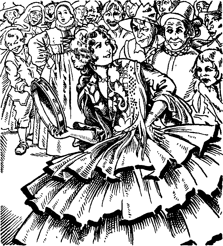 Crióse Preciosa en diversas partes de Castilla, y a los quince años de su edad su abuela putativa la volvió a la Corte y a su antiguo rancho, que es adonde ordinariamente le tienen los gitanos, en los campos de Santa Bárbara, pensando en la Corte vender su mercadería, donde todo se compra y todo se vende. Y la primera entrada que hizo Preciosa en Madrid fué un día de Santa Ana, patrona y abogada de la villa, con una danza en que iban ocho gitanas, cuatro ancianas y cuatro muchachas, y un gitano, gran bailarín, que las guiaba; y aunque todas iban limpias y bien aderezadas, el aseo de Preciosa era tal, que poco a poco fué enamorando los ojos de cuantos la miraban. De entre el son del tamborín y castañetas y fuga del baile salió un rumor que encarecía la belleza y donaire de la Gitanilla, y corrían los muchachos a verla y los hombres a mirarla. Pero cuando la oyeron cantar, por ser la danza cantada, ¡allí fué ello! Allí sí que cobró aliento la fama de la Gitanilla, y de común consentimiento de los diputados de la fiesta, desde luego le señalaron el premio y joya de la mejor danza; y cuando llegaron a hacerla en la iglesia de Santa María, delante de la imagen de Santa Ana, después de haber bailado todas, tomó Preciosa unas sonajas, al son de las cuales, dando en redondo largas y ligerísimas vueltas, cantó un romance.