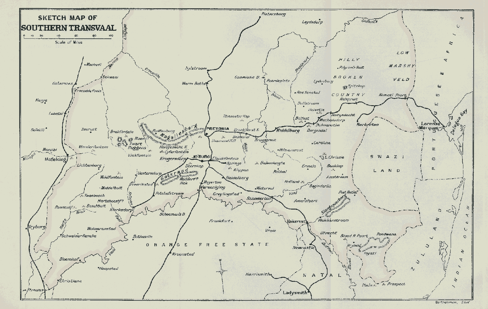 "An Army of 100,000 men is the utmost that Great Britain will be able to place in the field in South Africa, for the Indian and Colonial drafts must be provided for, and the Militia and other Auxiliary Forces, which are not of much account, are tethered to the country; but it will be sufficient for the purpose. Although the military system of Great Britain is hopelessly behind the times, she has always done wonders with her boomerangs, bows and arrows, and flint instruments. That Army will be fairly well furnished with modern weapons and equipment, and the excellent personality of the soldier will compensate to a great extent for incapacity in the Staff and superior officers. With this Army she will have to meet a brave but undisciplined opponent whose numbers cannot be estimated. Even if the Free Staters are included it is improbable {7} that more than 100,000 men can be put into the field. These have had no military training, their leaders will be unprofessional officers who will be unable to make good use of the munitions of War which the two Republics have been strangely allowed to import through British ports and to accumulate in large quantities. If the burghers of the Orange Free State throw in their lot with the Transvaalers, which is improbable as they have no quarrel with Great Britain, the numbers opposed to her will certainly be augmented, but the task before her will be greatly simplified. Instead of having to send one portion of her Army by way of Natal to effect a junction in the Transvaal, with the other portion working northwards through Kimberley and Mafeking, a campaign which would involve two long and vulnerable lines of communication, she will be able to strike at once through the heart of the Free State and will advance without much difficulty to Johannesburg and Pretoria. The hardest part of her task will be the passage of the Vaal, where a great battle will be fought, and the capture of Pretoria, which is reported to be well fortified. With Bloemfontein, Johannesburg, Pretoria and the railways in the possession of Great Britain, the opposition will collapse in a very few weeks, for no nation has ever been able to carry on a struggle when its chief towns and means of communication are in the enemy's possession."