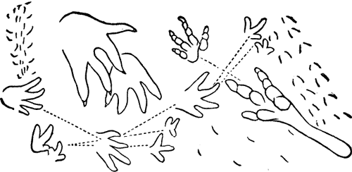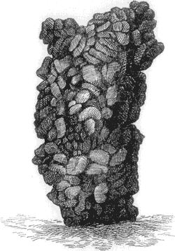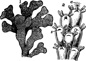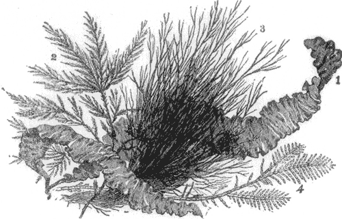 You will want to know how these leaves grew, and it is in this way. First a little free swimming animal, a mere living sac provided with lashes, settles down and grows into one little horny alcove, with its live creature inside, which in time sends off from it three to five buds, forming alcoves all round the top and sides of the first one, growing on to it. These again bud out, and you can thus easily understand that, in this way, in time a good-sized leaf is formed. Meanwhile the creatures also send forth new swimming cells, which settle down near to begin new leaves, and thus [pg 386] a tuft is formed; and long after the beings in earlier parts of the leaf have died and left their alcoves empty, those round the margin are still alive and spreading....