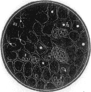 First, then, in the living specimen which I have here, those alcoves are not open as in the dead piece, but covered over with a transparent skin, in which, near the top of the alcove just where the curve begins, is a slit (s 2, Fig. 10) Unfortunately, the membrane covering this alcove is too dense for you to distinguish the parts within. Presently, however, if you are watching a piece of this living leaf in a flat water-cell under the microscope, you will see the slit slowly open, and begin to turn as it were inside out, exactly like the finger of a glove, which has been pushed in at the tip, gradually rises up when you put your finger inside it. As this goes on, a bundle of threads appears, at first closed like a bud, but gradually opening out into a crown of tentacles, each one clothed with hairs. Then you will see that the slit was not exactly a slit after all, but the round edge where the sac was [pg 384] pushed in. Ah! you will say, you are now showing me a polyp like those on the sertularian tree. Not so fast, my friend; you have not studied what is still under the covering skin and hidden in the living animal. I have, however, prepared a slide with this membrane removed and there you can observe the different parts, and learn that each one of these alcoves contains a complete animal, and not merely one among many mouths, like the polyp on Sertularia.