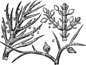 First of all I will pass round pieces of the dry leaf (1, Fig. 10), and while you are getting them I will tell you where I found the living ones. Great masses of the Flustra, as it is called, line the bottom and sides of my pool. They grow in tufts, standing upright on the rock, and looking exactly like hard gray seaweeds, while there is nothing to lead you to suspect that they are anything else. Yesterday I chipped off very carefully a piece of rock with a tuft upon it, and have kept it since in a glass globe by itself with sea-water, for the little creatures living in this marine city require a very good supply of healthy water and air. I have called it a "marine [pg 383] city," and now I will tell you why. Take the piece in your hand and run your finger gently up and down it; you will glide quite comfortably from the lower to the higher part of the leaf, but when you come back you will feel your finger catch slightly on a rough surface. Your pocket lens will show you why this is, for if you look through it at the surface of the leaf you will see it is not smooth, but composed of hundreds of tiny alcoves with arched tops; and on each side of these tops stand two short blunt spines, making four in all, pointing upwards, so as partly to cover the alcove above. As your finger went up it glided over the spines, but on coming back it met their points. This is all you can see in the dead specimen; I must show you the rest by diagrams, and by and by under the microscope.