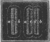 Another species of Diatoma (Fig. 8) called Diatoma vulgare, is a very simple and common form, and will help to explain how these plants grow. The two flinty valves a, b inside the cell are not quite the same size; the older one a is larger than the younger one b and fits over it like the cover of a pill-box. As the plant grows, the cell enlarges and forms two [pg 378] more valves, one c fitting into the cover a, so as to make a complete box ac, and a second, d, back to back with c, fitting into the valve b, and making another complete bd. This goes on very rapidly, and in this plant each new cell separates as it is formed, and the free diatoms move about quite actively in the water.