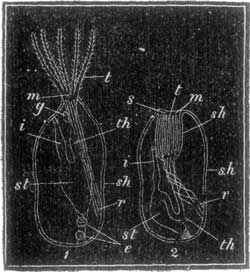 1, Animal protruding. 2, Animal retracted in the sheath, sh, Covering sheath, s, Slit. t, Tentacles. m, Mouth. th, Throat, st, Stomach. i, Intestine, r, Retractor muscle, e, Egg-forming parts. g, Nerve-ganglion.