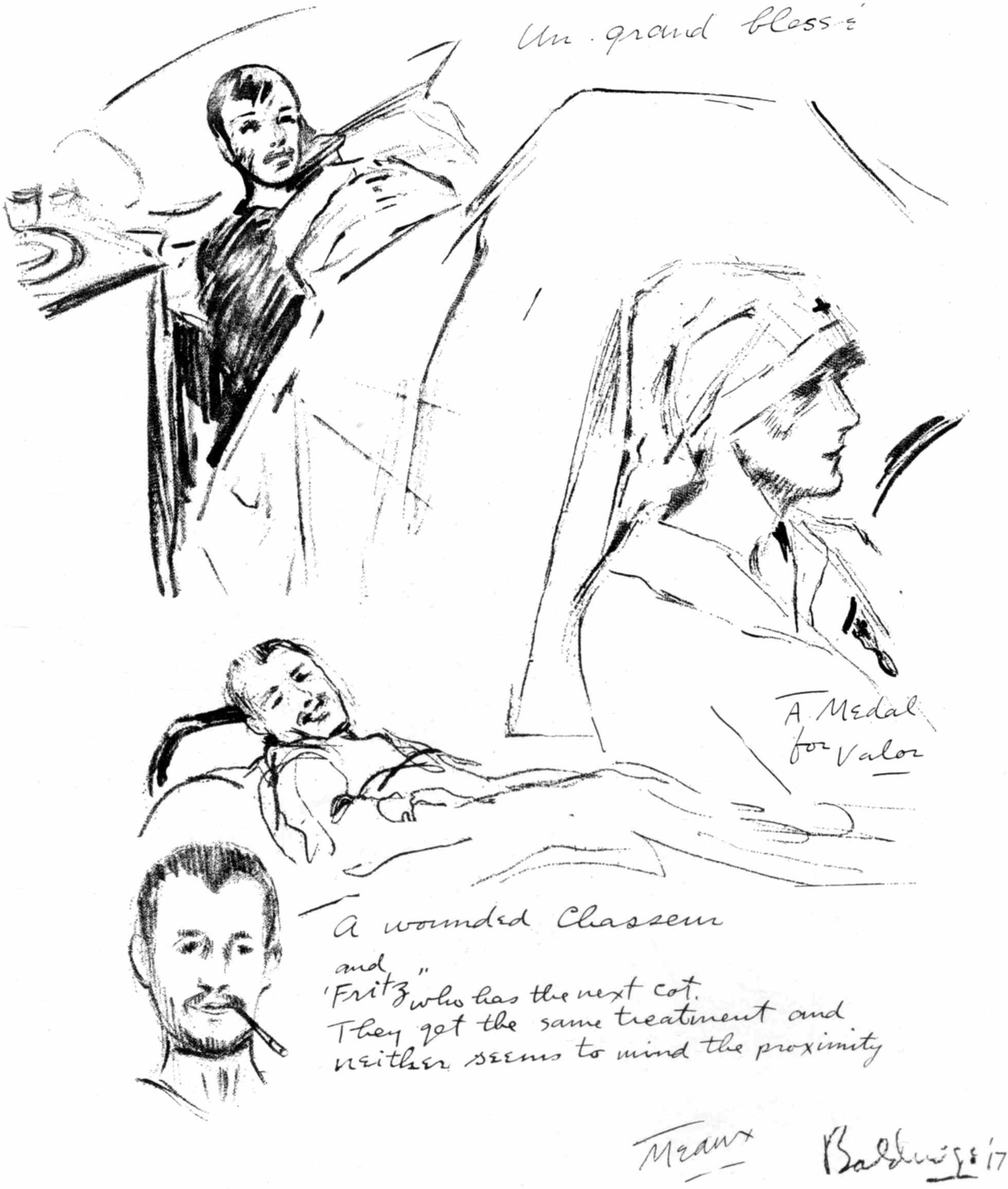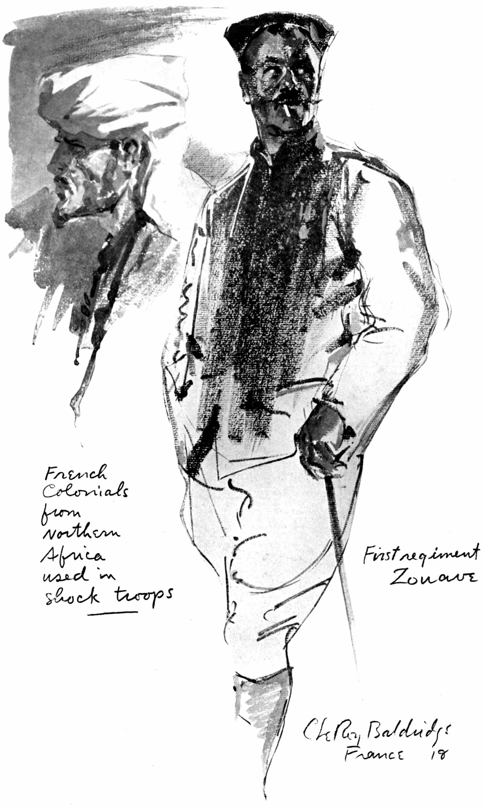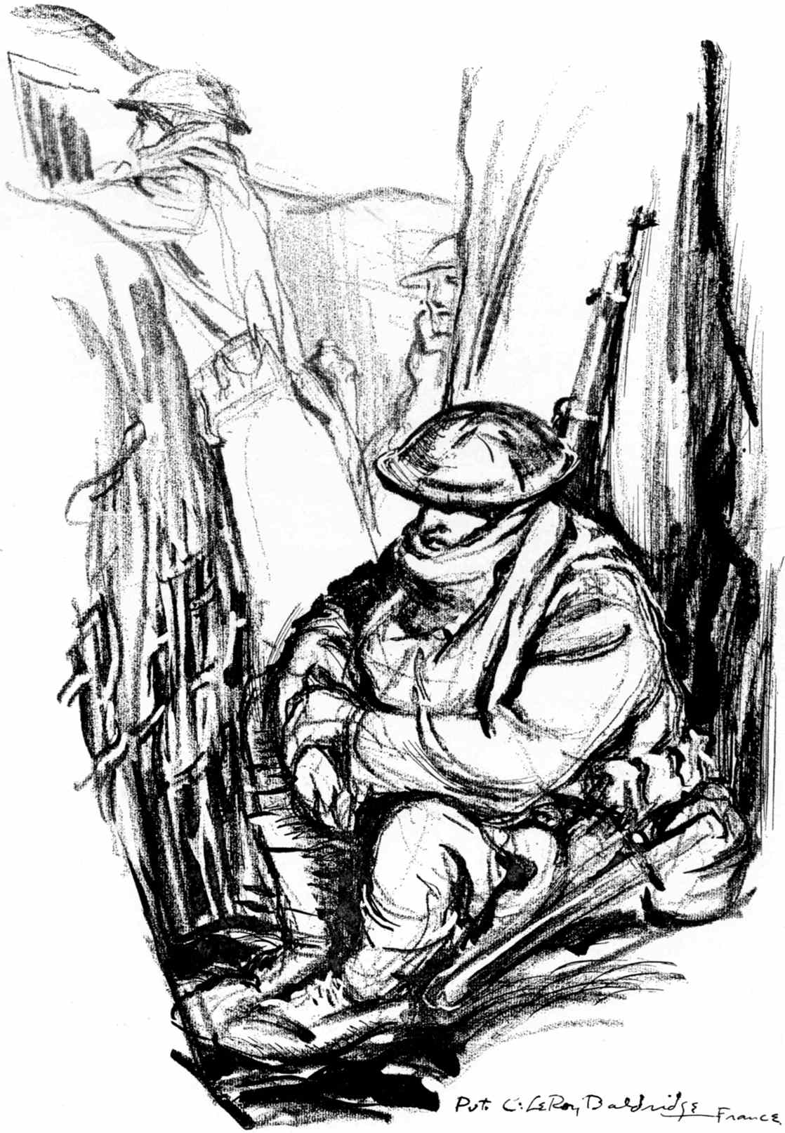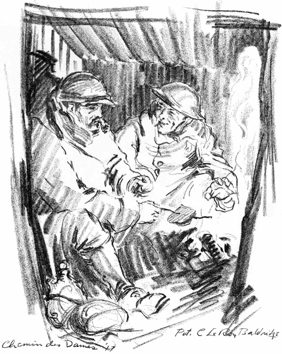These Sketches were made during a year's service as a camion driver with the French army in the Chemin-des-Dames sector and a year's service with the A.E.F. as an infantry private on special duty with "The Stars and Stripes," the official A.E.F. newspaper. Most of them were drawn at odd minutes during the French push of 1917 near Fort Malmaison, at loading parks and along the roadside while on truck convoy, and while on special permission to draw and paint with the French army given me by the Grand Quartier Gènèral during the time I was stationed at Soissons. The rest were drawn on American fronts from the Argonne to Belgium as my duties took me from one offensive to another.