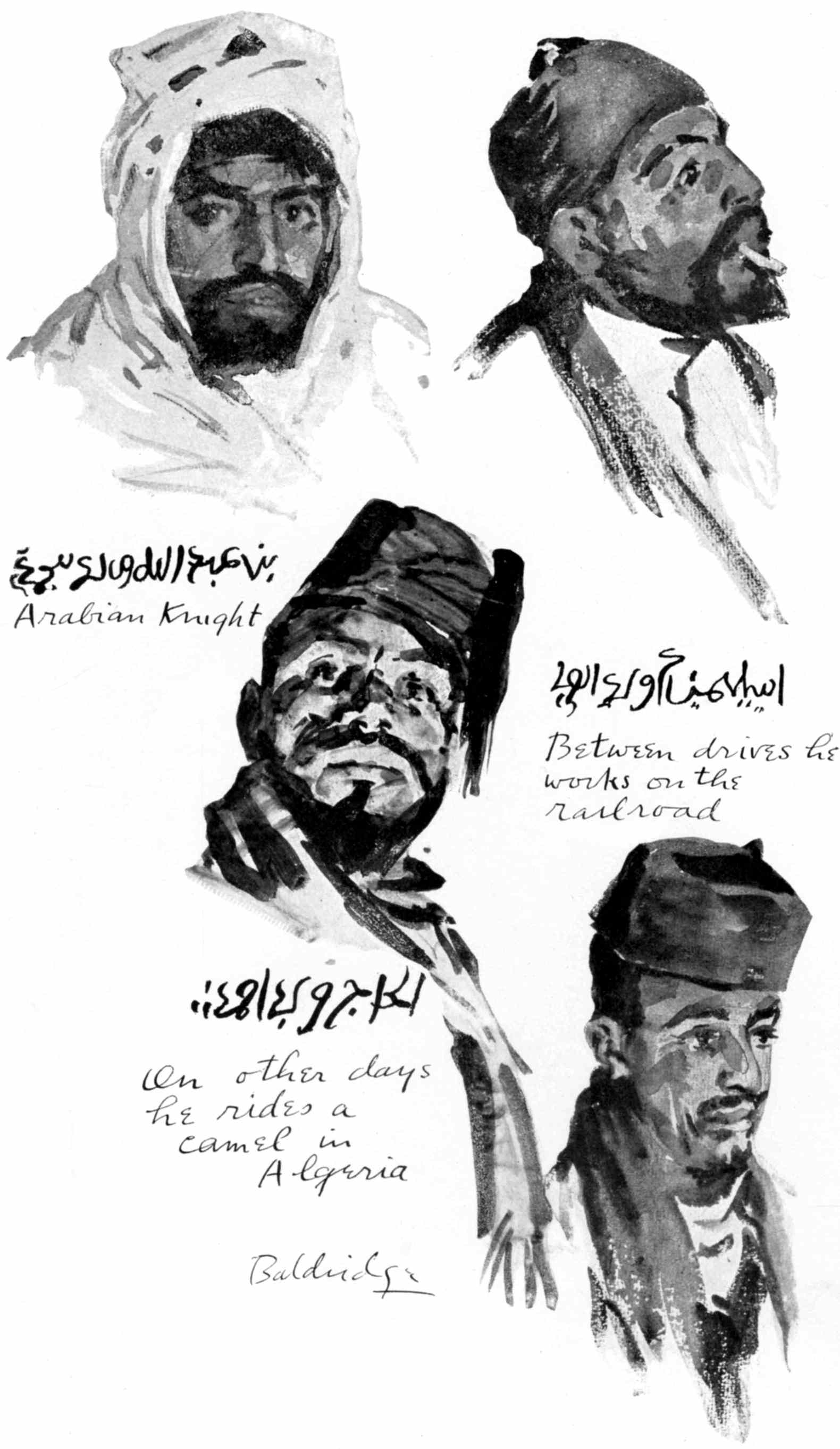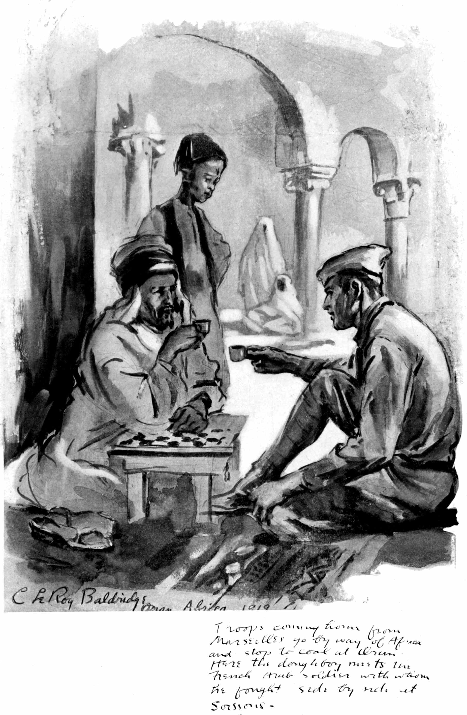 Troops coming home from Marseilles go by way of Africa and stop to coal at Oran. Here the doughboy rests the French Arab soldier with whom He fought side by side at Soissons.
