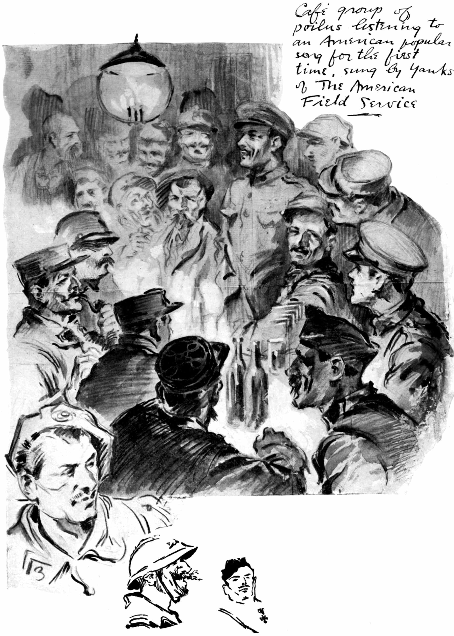Cafè group of poilus listening to an American popular song for the first time, sung by Yanks of The American Field Service