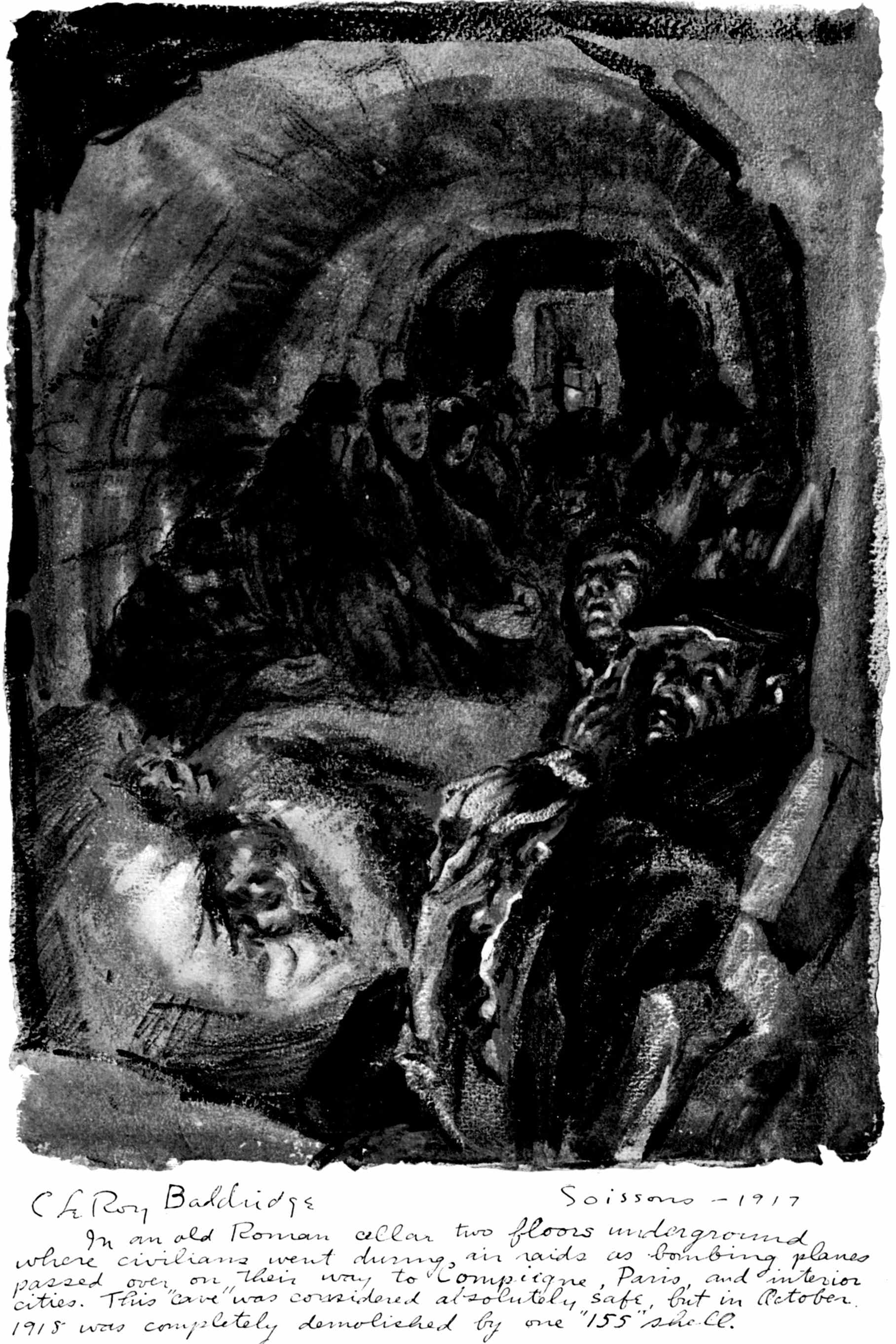 In an old Roman cellar two floors underground where civilians went during air raids as bombing planes passed over on their way to Compiegne, Paris, and interior cities. This "cave" was considered absolutely safe, but in October 1918 was completed demolished by one "155" shell.