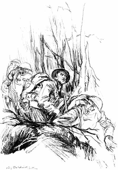 Awaiting the signal to attack. The sergeant is ready to blow the whistle for his squad to follow him out through a path in the barbed wire. In another minute they will advance close behind the bursting shells of a heavy barrage which, lifting, will leave them face to face with German machine guns.