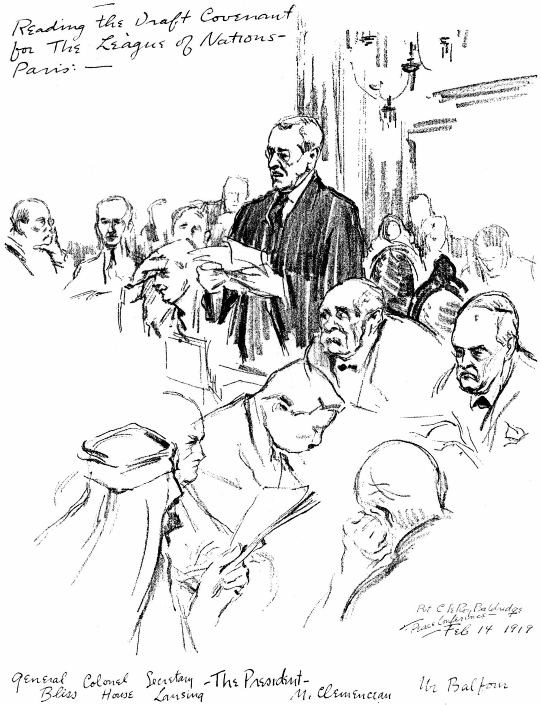 Reading the Draft Covenant for the League of Nations—Paris. (President Wilson, center, reads, other figures labelled as) General Bliss, Colonel House, Secretary Lansing, M. Clemenceau, Mr. Balfour