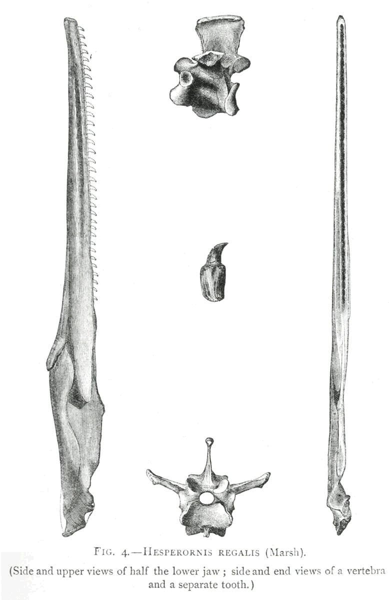 As we trace the history of birds back in time, we find their remains, sometimes in great abundance, throughout the whole extent of the tertiary rocks; but, so far as our present knowledge goes, the birds of the tertiary rocks retain the same essential characters as the birds of the present day. In other words, the tertiary birds come within the definition of the class constituted by existing birds, and are as much separated from reptiles as existing birds are. Not very long ago no remains of birds had been found below the tertiary rocks, and I am not sure but that some persons were prepared to demonstrate that they could not have existed at an earlier period. But in the course of the last few years, such remains have been discovered in England; though, unfortunately, in so imperfect and fragmentary a condition, that it is impossible to say whether they differed from existing birds in any essential character or not. In your country the development of the cretaceous series of rocks is enormous; the conditions under which the later cretaceous strata have been deposited are highly favourable to the preservation of organic remains; and the researches, full of labour and risk, which have been carried on by Professor Marsh in these cretaceous rocks of Western America, have rewarded him with the discovery of forms of birds of which we had hitherto no conception. By his kindness, I am enabled to place before you a restoration of one of these extraordinary birds, every part of which can be thoroughly justified by the more or less complete skeletons, in a very perfect state of preservation, which he has discovered. This Hesperornis (Fig. 3), which measured between five and six feet in length, is astonishingly like our existing divers or grebes in a great many respects; so like them indeed that, had the skeleton of Hesperornis been found in a museum without its skull, it probably would have been placed in the same group of birds as the divers and grebes of the present day.[1]