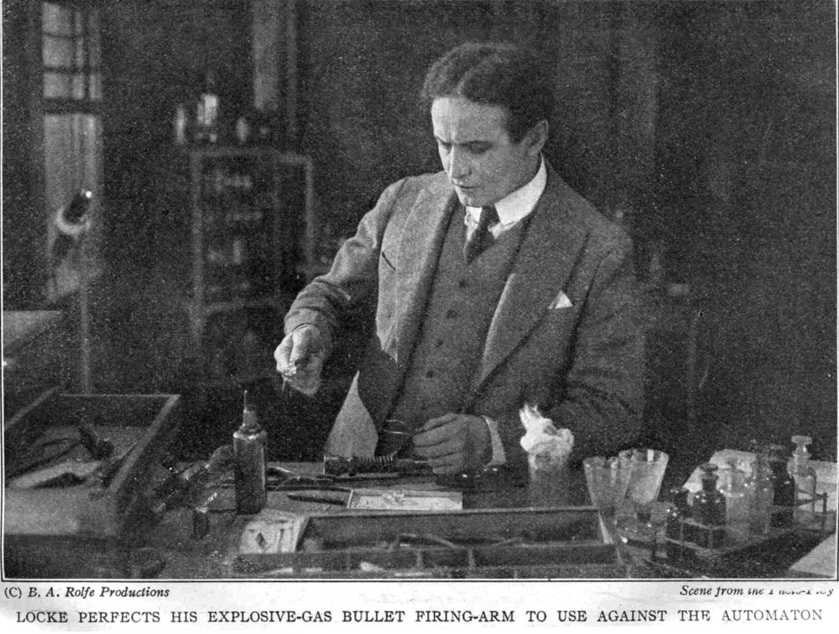 locke perfects his explosive-gas bullet firing-arm to use against the automaton