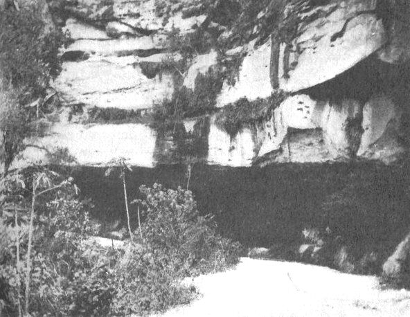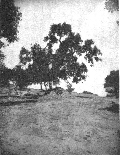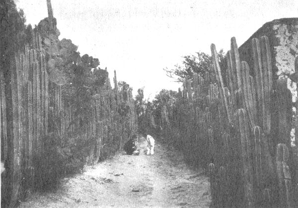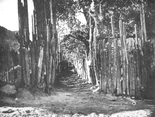 Beyond Mitla the valley narrows and the road rises onto a gently sloping terrace; when it strikes the mountains it soon becomes a bridle-path zigzagging up the cliffside. As we mounted by it, the valley behind expanded magnificently under our view. We passed through a belt of little oak trees, the foliage of which was purple-red, like the autumnal coloring of our own forests. Higher up we reached the pine timber. As soon as we reached the summit, the lovely valley view was lost and we plunged downward, even more abruptly than we had mounted, along the side of a rapidly deepening gorge. At the very mouth of this, on a pretty terrace, we came abruptly on the little town of San Lorenzo with palm-thatched huts of brush or cane and well grown hedges of organo cactus. Here we ate tortillas and fried-eggs with chili. Immediately on setting out from here we rode over hills, the rock of which was deeply stained with rust and streaked with veins of quartz, up to a crest of limestone covered with a crust of stalagmite.