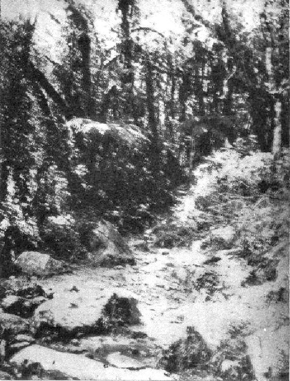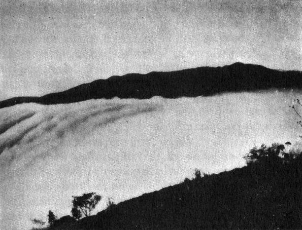 For some distance our road led up a cañon. Reaching its head, we gained the pass at two o'clock. A wonderful sight here presented itself. Above us was a brilliant blue sky—cloudless; every detail of the rock crest upon which we stood was clear. Forested to its summit, the ridge formed the half of a magnificent amphitheatre, whose slopes had been vertically furrowed at a hundred points by torrents; to the left a spur projected, the crest of which sloped gently downward, forming an enclosing wall upon that side. Before us, beyond the valley, was a boundary line of mountain masses, sharply outlined against the sky. Lower ridges, nearer to us, paralleled this distant rampart. The only apparent outlet from this valley was around the spur to our left. Looking down upon this magnificent valley, we saw it occupied by a sea of clouds, the level surface of which looked like a lake of water flecked here and there with whitecaps. The higher hills within the valley rose like islands from the water; to the left a mighty river seemed to flow around the spur, out into a boundless sea of cloud beyond. The level surface of this lake, river, and sea of clouds was hundreds of feet below us.