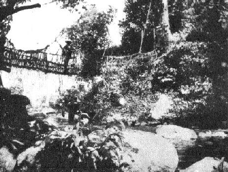 Passing Camotlan, we entered a magnificent gorge, along one side of which we climbed, passing in front of lovely cascades and having magnificent outlooks. While we were on this trail, we encountered the maestro from Ixcuintepec, who was on his way to Quezaltepec to spend his holiday. A whispered word with his half-brother, our companion, quickly changed his plan, and he accompanied us. Upon this trail we found our first swinging foot-bridges made of lianas, or vines, hanging from trees. These are, of course, only suitable for foot-travellers, but are a great convenience, where streams are likely to be swollen. Two or three long and slender vines, laid side by side and lashed together, form the footway, which is swung from one tree to another; other lianas are stretched across as side rails, smaller vines being twined in between and around them to hold them in place; long vines, pendant from the high branches of the supporting trees, are fastened to the upper rails to steady and anchor these frail bridges, which swing and yield with every weight.