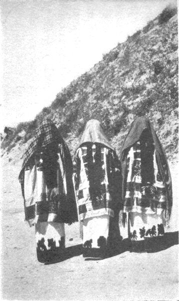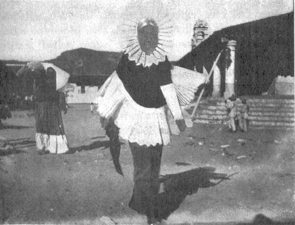 While this drama was being enacted under the shade-tree, another amusement, in connection with the fiesta of San Marcos, was in progress in front of the church. The musicians with the long horns made doleful music; a dozen gayly-costumed dancers took part. They wore dark trousers slitted up the sides; bright kerchiefs, with the point hanging down in front, were tied about the waists; crowns of plumes were on the heads; red vests and kerchiefs, crossed at the neck, completed the costume. One player, who seemed to be a leader, carried a tri-colored flag; another represented a man on horseback, by creeping into a frame of sticks, covered with cloth, in the shape of a horse. They danced in the full sunlight for hours; their movements were varied and pretty, quite different, too, from the figures in the danza de la Conquista. Two outside characters played the clown. One of these was a little lad dressed in a garment representing a tiger-skin, while over his face he wore a heavy, old wooden mask, imitating an animal's head. The other was older, dressed in a leather suit, with a wooden mask like a vacant-looking human face. These two were very popular, and indulged in many acts that bordered on the obscene. We got no satisfactory explanation of this whole performance. The cura said that it represented the conflict between Christ and the Jews; this we greatly doubted.