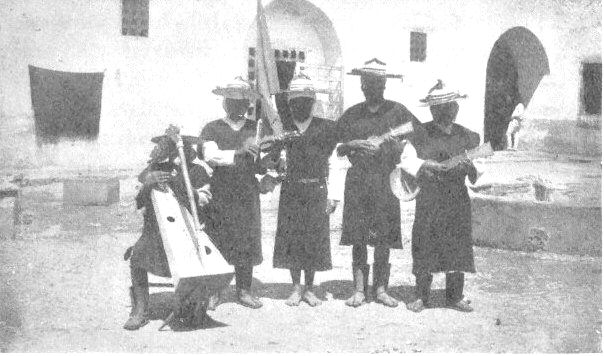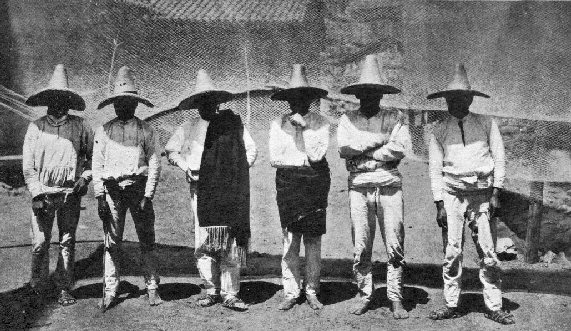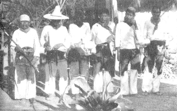 Passing through Zanatepec, we stopped for Sunday at Tanatepec. Here we found ourselves again upon the low coast road. It was, however, our last point of low altitude, as from there we struck inland over a higher, cooler, and more interesting mountain road. At Zanatepec we first saw the marimba played. This musical instrument, unquestionably African in name and origin, is hardly found north of Chiapas, but is extremely common through Central America. It consists of a wooden frame supporting keys made of wood and metal, each of which gives forth its own note when struck with small hammers. Below the keys of lowest tone are hung tubes, pipes, or gourds, as sounding boxes to increase the sound produced by striking the key. Usually four players perform at one time, each using two or more little hammers. The music is rapid and brilliant, somewhat resembling that of the piano. The instrument usually has some fanciful name, which is painted upon it. The one at Tanatepec was La Azteca (The Aztec Lady), while our next one was La reina de las flores (The queen of the flowers). At Zanatepec, La Azteca was an advertising part of a traveling circus. The troupe consisted of three men and three women, the latter of whom seemed to be mulattos. The men were ridiculously garbed and painted to represent wild indians. The real, live indians, who followed these clowns in delighted crowds, enjoyed thrills of terror at their whoops, fierce glances, and wild antics, and assured us that these actors were, if not the real thing, at least wonderfully accurate impersonations of the natives of the Estados unidos (United States)—the land of the "Apaches."