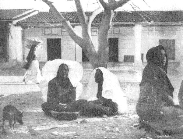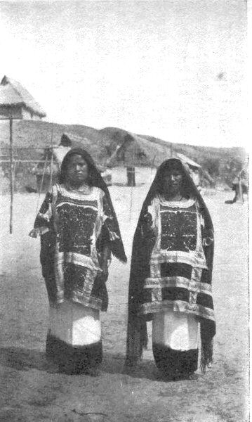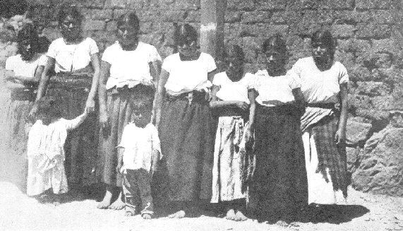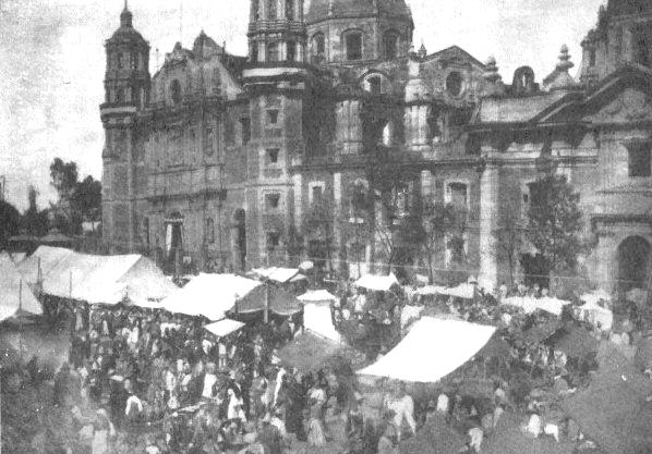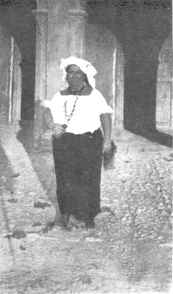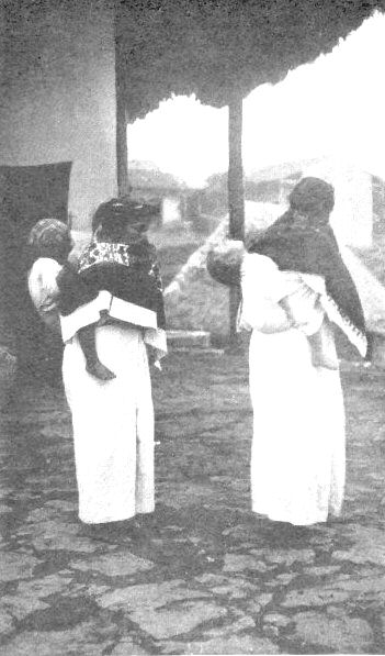 Tehuantepec is meanly built; it is hot and dusty, and the almost constant winds drive the dust in clouds through the streets. But its picturesque market is a redeeming feature. Every morning it is crowded and presents a brilliant and lively spectacle. All the trade is in the hands of women, and the Tehuantepec women have the reputation of being the handsomest in the world. They are large, finely-built, and in their movements exhibit an indescribable freedom and grace. Their natural attractions are set off by a characteristic and becoming costume. The huipilili is a little sleeveless waist, loose at the neck and arms, and so short that it rarely reaches to the waist-line, to which, of course, it is supposed to extend; it is of bright cotton—red, brown, purple, with stripes or spots of white—and is stitched at the neck with yellow silk. The enagua, or skirt, is a strip of heavy cotton cloth, less than a yard wide, which is simply wrapped around the figure and hangs from the waist, being held in place by a brightly colored belt or girdle. The enagua is usually a rich red, but it is sometimes a fine violet purple. It reaches but little below the knees. It generally fails to meet the huipilili above, so that a broader or narrower band of fine, dark brown separates the two garments. Nothing is worn on the feet, which are exposed, as are also the finely shaped and beautifully developed arms. But the most striking article in the Tehuantepec woman's costume is her huipíl, which travellers usually describe as a head-dress, although it is nothing of the kind. It is in reality a waist-garment with sleeves. It is made of lace or cotton, or linen, and is bordered at the neck, the sleeves, and the lower margin with broad ruffs of pleated lace. Only at church or on some important or ceremonial occasion is the huipíl worn as it was meant to be. Usually at church the wearer draws the garment over her upper body, but does not put her arms into the sleeves, nor her head through the neck-opening, simply fitting her face into this in such a way that it appears to be framed in a broad, oval, well-starched border of pleated lace. Usually, however, the garment is not even worn in this manner, but is turned upside down and carelessly hung upon the head so that the broad lower fringe of lace falls back upon the hair, while the upper part of the garment, with the sleeves, the collar, and cuff-ruffs, hangs down upon the back. The whole effect is that of a fine crest rising from the head, coursing down the back, and moving with the breeze as the woman walks. These Zapotec women are fond of decoration, but particularly prize gold coins. In the past, when Tehuantepec was more important than now, it was no uncommon thing to see a woman in this market with several hundred dollars in gold coins hanging to her neck chain. In these later days of little trade and harder times, these once prized decorations have been spent, and it is rare to see any woman wearing more than twenty to fifty dollars as display.