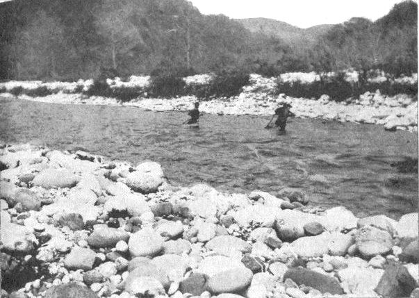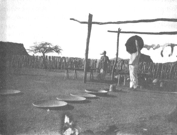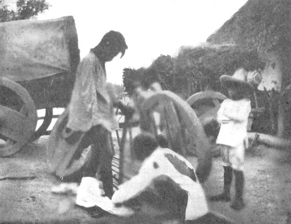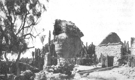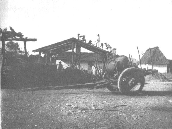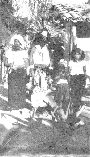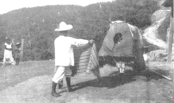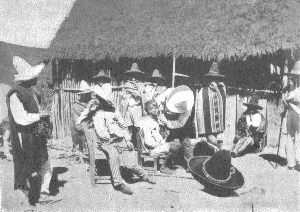 Turning north the next day, onto the Niltepec road, we wandered from our trail, losing five leagues of space and more than three hours of time. The country through which we passed was terribly dry; there were no running streams. We crossed the bed of one dried river after another—streaks of sand and pebbles. The people in the villages near these dried river-beds dug holes a foot or two deep into this sand and gravel and thus got water. At the place where we camped for the night, Suspiro Ranch, a new house was being palm-thatched. All the men and boys of the neighborhood were helping; the labor was carefully divided; some were bringing in great bundles of the palm leaves; others pitched these up to the thatchers, who were skilfully fitting them under and over the poles of the roof framework and then beating them firmly home. Many of the helpers had come considerable distances and spent the night, so that we shared our room with quite a dozen men and boys, while the women and children slept in another house.