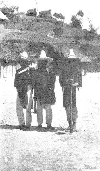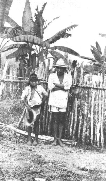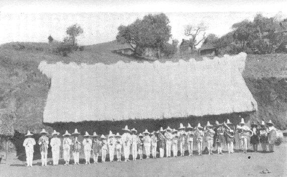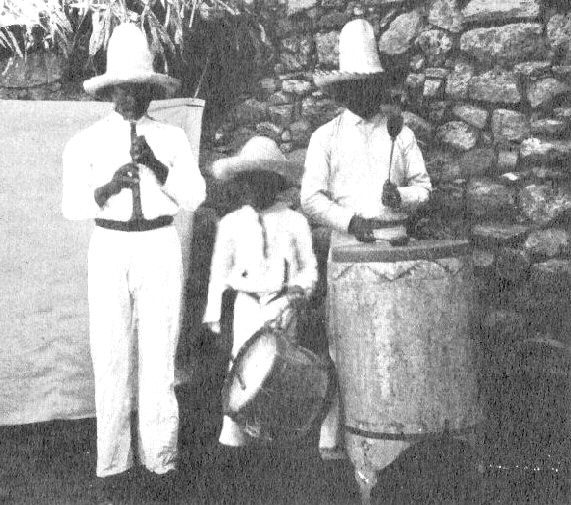 By evening most of the indians in the town were drunk. At sunset a miserable procession started from the church, passed through the village, and then returned to the church; composed mostly of women, it was preceded by a band of music and the men who carried the santito. Later, we heard most disconsolate strains, and, on examination, found four musicians playing in front of the old church; three of them had curious, extremely long, old-fashioned horns of brass, while the fourth had a drum or tambour. The tambour was continuously played, while the other instruments were alternated in the most curious fashion. The music was strange and wierd, unlike any that we had ever heard before. However, we became thoroughly familiar with it before we had traversed the whole Mixe country, as we heard it twice daily, at sunrise and after sunset. It was the music of the Candelaria, played during the nine days preceding February 2d. As we sat listening to the music the presidente of the town appeared. His Spanish, at no time adequate, was now at its worst, as he was sadly intoxicated. We tried to carry on a conversation with him, but soon seeing that naught but disaster could be expected, if we continued, we discreetly withdrew to our room.
