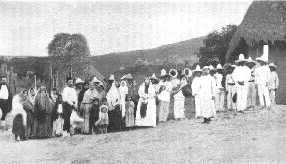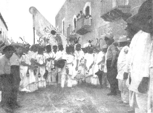 Although we stayed several days at Juquila, the presidente did not return, during our presence, to resume his duties of office. We were, however, well treated. The cura aided us with advice, information, and helpers. While we were in the village the danza de la Conquista took place. It is a popular play, with much dancing and music, and little action or dialogue, which celebrates the Conquest of Mexico by Cortez. It was rendered in the shade of a great tree near the church. In the first act, nine men and two girls took part; in the second act, there were many others. The nine men and two girls represented Indians; they wore crowns with plumes of snow-white down; in their hands they carried a rattle, made from the fruit of a tree and a wand of white down, with which they beat time. One man, representing Montezuma, had a crown of brilliantly colored plumes. The other eight men were warriors; the two girls were "Malinches." The first act consisted of a series of dances, including a very pretty maypole dance. The play lasted about three hours, and represented the life of the indians before the Conquest—Montezuma in his court, with the amusements celebrated for his entertainment. Hearing of the arrival of the Spaniards, he is filled with sad forebodings, which the amusements fail to dispel. In the second act, Hernando Cortez appears, with soldiers. While the costumes of the indians were gay, and more or less attractive, those of these European warriors were ludicrously mongrel and unbecoming. The new-comers demanded that Montezuma acknowledge the authority of the King of Spain and the cross of Christ. Conversations, demands, replies, tableaus, sword-dances, etc., ensued. Finally, Montezuma and his warriors yielded, and kissed the crucifix.