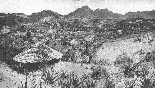 Ayutla is situated on a high terrace, before which opens a lovely valley and behind which rises a fine mountain slope. The village church, while large, is roofless; the town-house lies below the village, and by it are two jails for men and women. The houses of the village are small, rectangular structures of a red-brown-ochre adobe brick; the roofs slope from in front backward, and are covered with red tiles they project in front so as to cover a little space before the house.