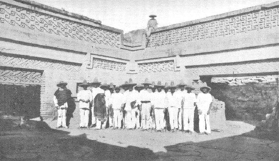 The evening we were at Mitla, Señor Quiero came hurrying to our room and urged us to step out to the corridor before the house to see some Mixes. It was our first glimpse of representatives of this little known mountain people. Some thirty of them, men and women, loaded with fruit, coffee, and charcoal, were on their way to the great fair and market, at Tlacolula. They had now stopped for the night and had piled their burdens against the wall. Wrapping themselves in their tattered and dirty blankets, they laid themselves down on the stone floor, so close together that they reminded me of sardines in a box. With a blazing splinter of fat pine for torch, we made our inspection. Their broad dark faces, wide flat noses, thick lips and projecting jaws, their coarse clothing, their filthiness, their harsh and guttural speech, profoundly impressed me and I resolved to penetrate into their country and see them in their homes, at the first opportunity.