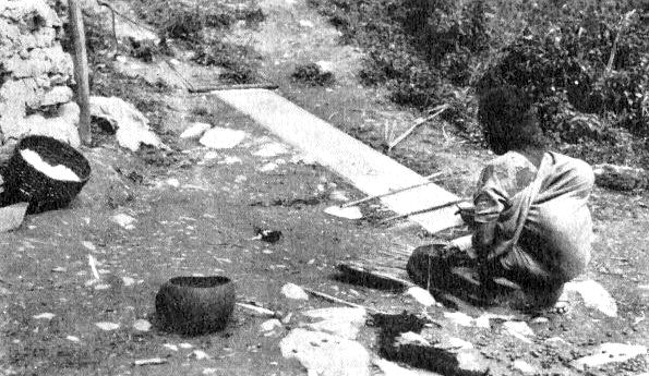 7. Picture of Otomi woman beating bark paper. Printed on sheet of the original paper; mounted.
