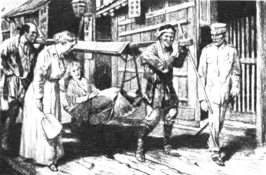 Without further argument I called to some coolies to come with a "kago," a kind of lie-down-sit-up basket swung from a pole, and in it we laid the weak, protesting woman.