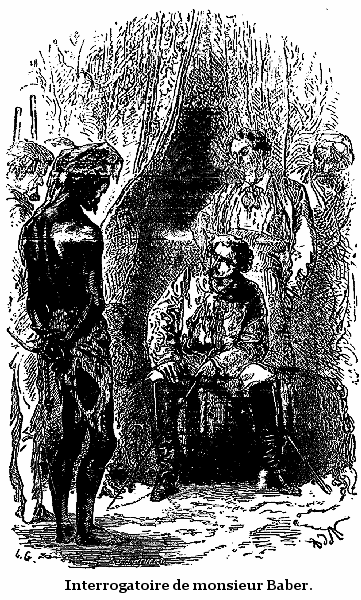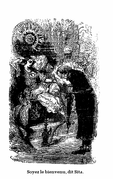 Sougriva se prosterna devant son maître et devant Sita en élevant ses mains en forme de coupe vers le ciel; puis, avec la permission de Corcoran, il s'assit sur un tapis de Perse, attendant qu'on le questionnât.
