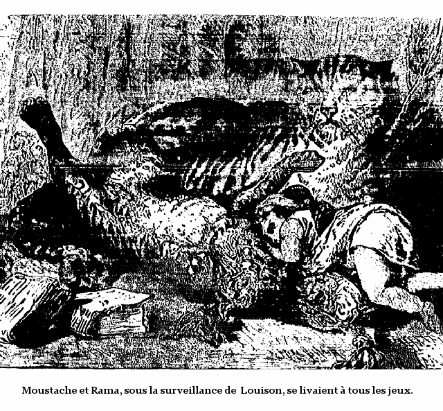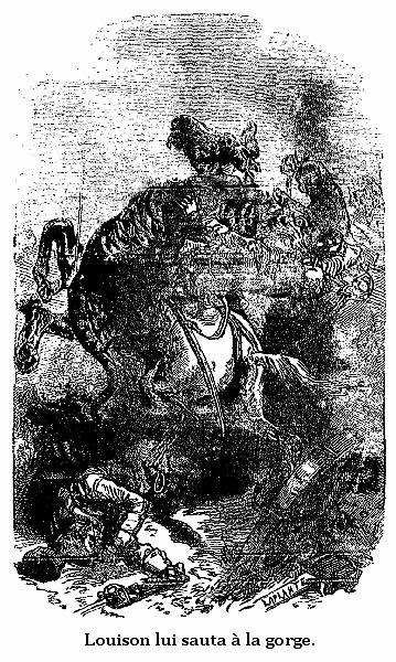 «Louison allait les suivre, mais le capitaine la retint, pour ne pas les effrayer davantage, et alla droit au plus fakir de la bande, c'est-à-dire au plus sale et au plus déguenillé. C'était un vieux à barbe blanche, qui paraissait très-respecté de tous les autres. Pour lors, le capitaine se met à lui parler dans son patois, qui est, à ce qu'on m'a dit depuis, une très-belle langue et faite pour les savants. Ce qu'ils se dirent, je ne l'ai pas entendu; mais j'ai vu les gestes. Le capitaine insistait toujours pour avoir son Gouroukaramta; l'autre refusait toujours. Tout à coup voilà Louison qui s'impatiente, se dresse debout sur ses pattes de derrière et appuie ses pattes de devant sur les épaules de Corcoran; histoire de se faire caresser, la câline. Voyant ça, le fakir tombe à genoux, s'écrie que la volonté de Dieu se déclare, que le capitaine est la dixième incarnation de Vichnou, qu'il est prédit dans ses livres que Vichnou doit venir sur la terre avec un tigre apprivoisé; puis il va chercher son manuscrit et le met dans les mains du capitaine, qui le regardait sans sourciller et sans paraître étonné, comme s'il eût fait le Vichnou toute sa vie.»
