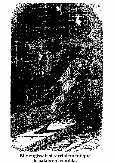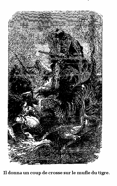«Pour lors, tous ces fakirs étaient accroupis autour de leur temple lorsque nous arrivâmes. Pas un d'eux ne leva la tête et ne dit un mot de politesse. Voyant ça, le capitaine siffla Louison, qui sauta légèrement à terre, comme une jolie fille qui va au bal. Au premier bond de la tigresse, qui pourtant ne fit de mal à personne, tous ces endormis se réveillèrent, et furent debout en un clin d'oeil,—où je vis bien qu'aucun d'eux n'était paralytique, car ils se sauvèrent tous ensemble dans le temple en criant: Voici Baber Sahib (voici le seigneur Tigre)! et en implorant Siva.