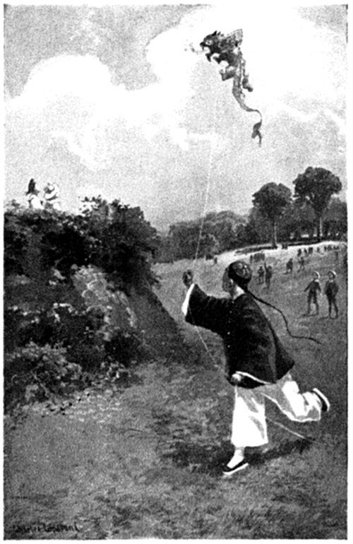 There sat a little Chinese boy, as it seemed, although at second glance he looked rather old for a boy. He wore blue clothes and was shelling peas. His glossy black "pigtail" reached down to the floor, and the kitten was trying to raise the end of it in her pretty white paws. As Lucy had said, heavy black silk cords were braided in with the hair, with handsome tassels.