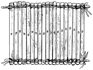 § IV. The warp is thus constructed: A frame of four sticks is made, not unlike the frame of the loom, but lying on or near the ground, instead of standing erect. The two sticks forming the sides of the frame are rough saplings or rails; the two forming the top and bottom are smooth rounded poles—often the poles which afterwards serve as the beams of the loom; these are placed parallel to one another, their distance apart depending on the length of the projected blanket.