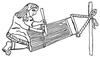 § V. The mode of applying the healds is simple: (1) the weaver sits facing the loom in the position for weaving; (2) she lays at the right (her right) side of the loom a ball of string which she knows contains more than sufficient material to make the healds; (3) she takes the end of this string and passes it to the left through the shed, leaving the ball in its original position; (4) she ties a loop at the end of the string large enough to admit the heald-rod; (5) she holds horizontally in her left hand a straightish slender rod, which is to become the heald-rod—its right extremity touching the left edge of the warp—and passes the rod through the loop until the point of the stick is even with the third (second anterior from the left) thread of the warp; (6) she puts her finger through the space between the first and third threads and draws out a fold of the heald-string; (7) she twists this once around, so as to form a loop, and pushes the point of the heald-rod on to the right through this loop; (8) she puts her finger into the next space and forms another loop; (9) and so on she continues to advance her rod and form her loops from left to right until each of the anterior (alternate) warp-threads of the lower shed is included in a loop of the heald; (10) when the last loop is made she ties the string firmly to the rod near its right end.