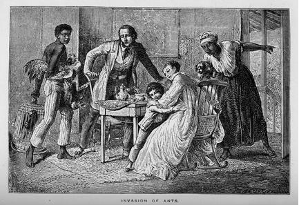 The Brazils suffer, too, from a plague of insects,—from mosquitoes, ants, baraten, and sand-fleas; against the attacks of which the traveller finds it difficult to defend himself. The ants often appear in trains of immeasurable length, and pursue their march over every obstacle that stands in the way. Madame Pfeiffer, during her residence at a friend’s house, beheld the advance of a swarm of this description. It was really interesting to see what a regular line they formed; nothing could make them deviate from the direction on which they had first determined. Madame Geiger, her friend, told her she was awakened one night by a terrible itching: she sprang out of bed immediately, and lo, a swarm of ants were passing over it! There is no remedy for the infliction, except to wait, with as much patience as one can muster, for the end of the procession, which frequently lasts four to six hours. It is possible, to some extent, to protect provisions against their attacks, by placing the legs of the tables in basins filled with water. Clothes and linen are enclosed in tightly-fitting tin canisters.