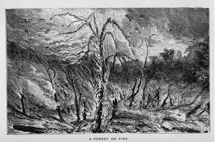 p. 44Another novelty which much impressed our traveller was the sight of the frequent burning forests. These are set on fire in order to clear the ground for cultivation. In most cases she viewed the tremendous spectacle from a distance; but one day she realized it in all its details, as her road lay between a wood in flames on the one hand, and the brushwood, crackling and seething, on the other. The space between the double rows of fire did not exceed fifty paces in breadth, and was completely buried in smoke. The spluttering and hissing of the fire was distinctly audible, and through the dense mass of vapour shot upward thick shafts and tongues of flame, while now and then the large trees crashed to the ground, with loud reports, like those of artillery.