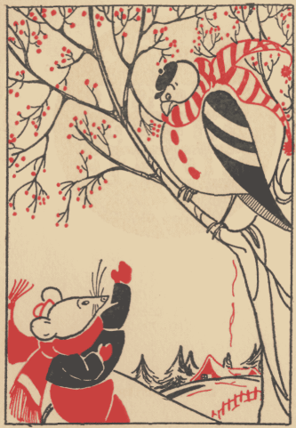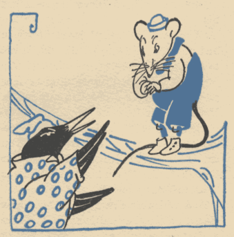 During the uproar Dickie Deer Mouse managed to slip out of Mr. Crow's house without being seen. But he was too polite to run away. Instead of hurrying off to escape a scolding from Mr. Crow he clung to a near-by branch and called as loudly as he could: