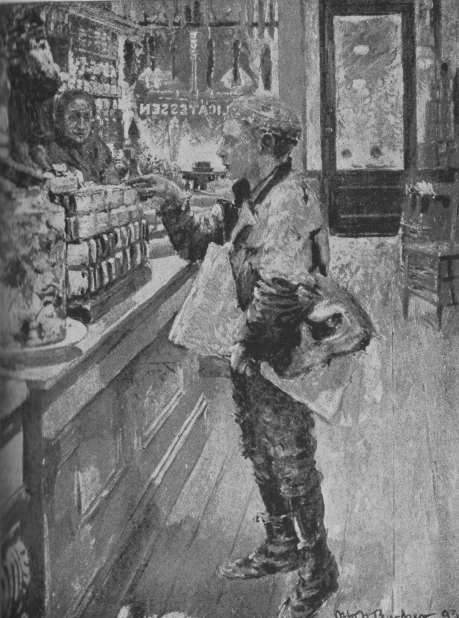 With utter amazement the boys saw him disappear through the door under the tinkling bell into the charmed precincts of smoked herring, jam, and honey-cakes. Petrified at their peep-holes, they watched him, in the veritable presence of Santa Claus himself with the fir-branch, fish out five battered pennies from the depths of his pocket and pass them over to the woman behind the jars, in exchange for one of the bundles of honey-cakes tied with blue. As if in a dream they saw him issue forth with the coveted prize.