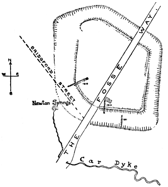 (xv) Wroxeter (Viroconium). The systematic excavation of Wroxeter begun in 1912 by Mr. J. P. Bushe-Fox on behalf of the London Society of Antiquaries and the Shropshire Archaeological Society, was carried by him through its third season in 1914. The area examined lay immediately north of the temple uncovered in 1913. The main structure in it was a large dwelling-house 115 feet long, with extensions up to 200 feet, which possessed at least two courtyards, a small detached bath-house, various mosaic and cement floors, hypocausts, and so forth. It had been often altered, and its excavation and explanation were excessively difficult. Mr. Bushe-Fox thinks that it may have begun as three shops giving on to the north and south Street which bounds its eastern end. Certainly it became, in course of time, a large corridor-house with a south aspect and an eastern wing fronting the street, and as such it underwent several changes in detail. Beyond its western end lay a still more puzzling structure. An enceinte formed by two parallel walls, about 13 feet apart, enclosed a rectangular space of about 150 feet wide; the western end [22] of it, and therefore its length, could not be ascertained; the two corners uncovered at the east end were rounded; an entrance seems to have passed through the north-east corner. It has been called a small fort, an amphitheatre, a stadium, and several other things. But a fort should be larger and would indeed be somewhat hard to account for at this spot; while a stadium should have a rounded end and, if it was of orthodox length, would have extended outside the town into or almost into the Severn. Interest attaches to a water-channel along the main (north and south) street. This was found to have at intervals slits in each side which were plainly meant for sluice-gates to be let down; Mr. Bushe-Fox thinks that the channel was a water-supply, and not an outfall, and that by the sluice-gates the water was dammed up so as, when needed, to flow along certain smaller channels into the private houses which stood beside the road. If so, the discovery has much interest; the arrangement is peculiar, but no other explanation seems forthcoming.